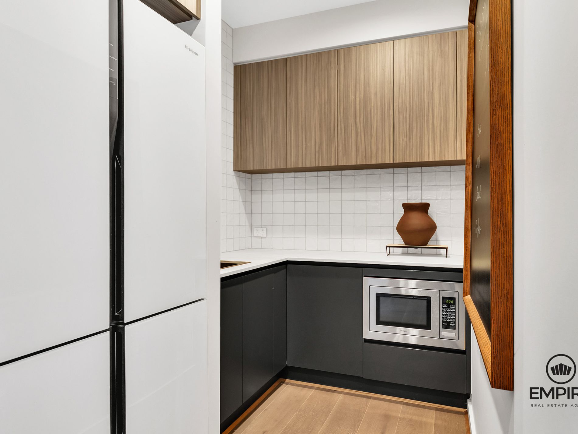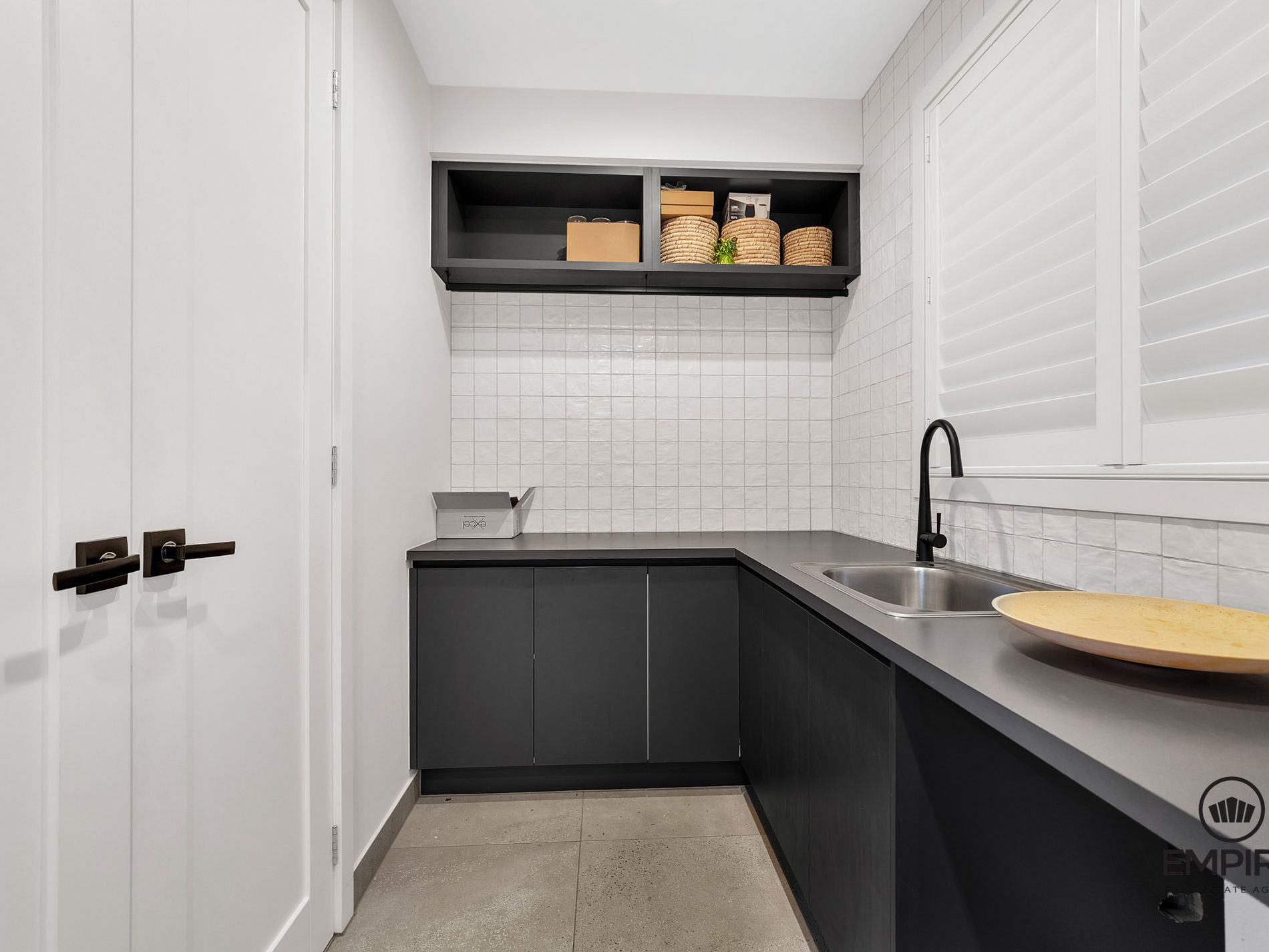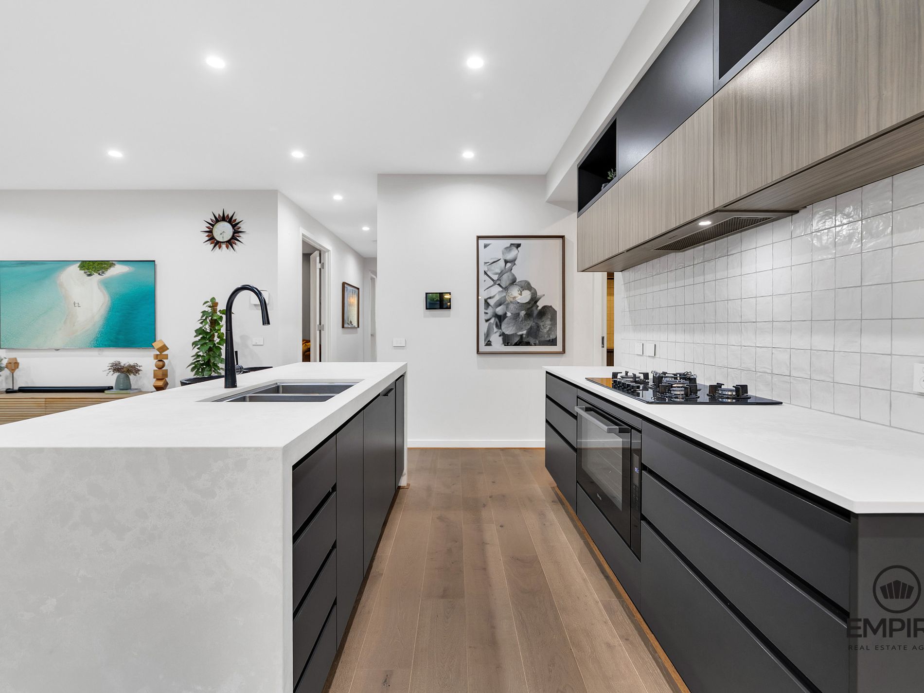 -Stunning kitchen boasting an island benchtop, black stainless-steel appliances and butler's pantry